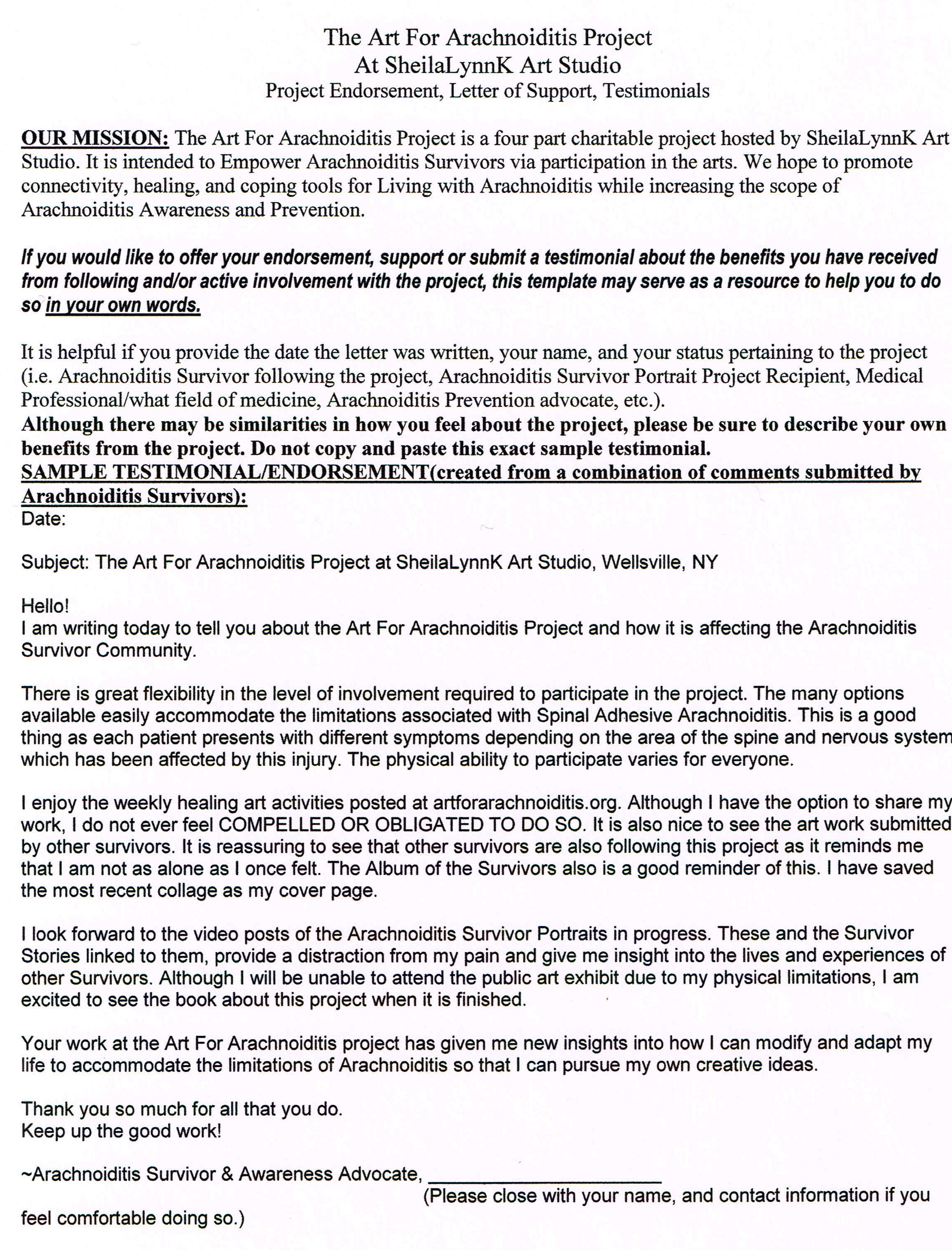 Sample Endorsement Letter for the Art For Arachnoiditis Project