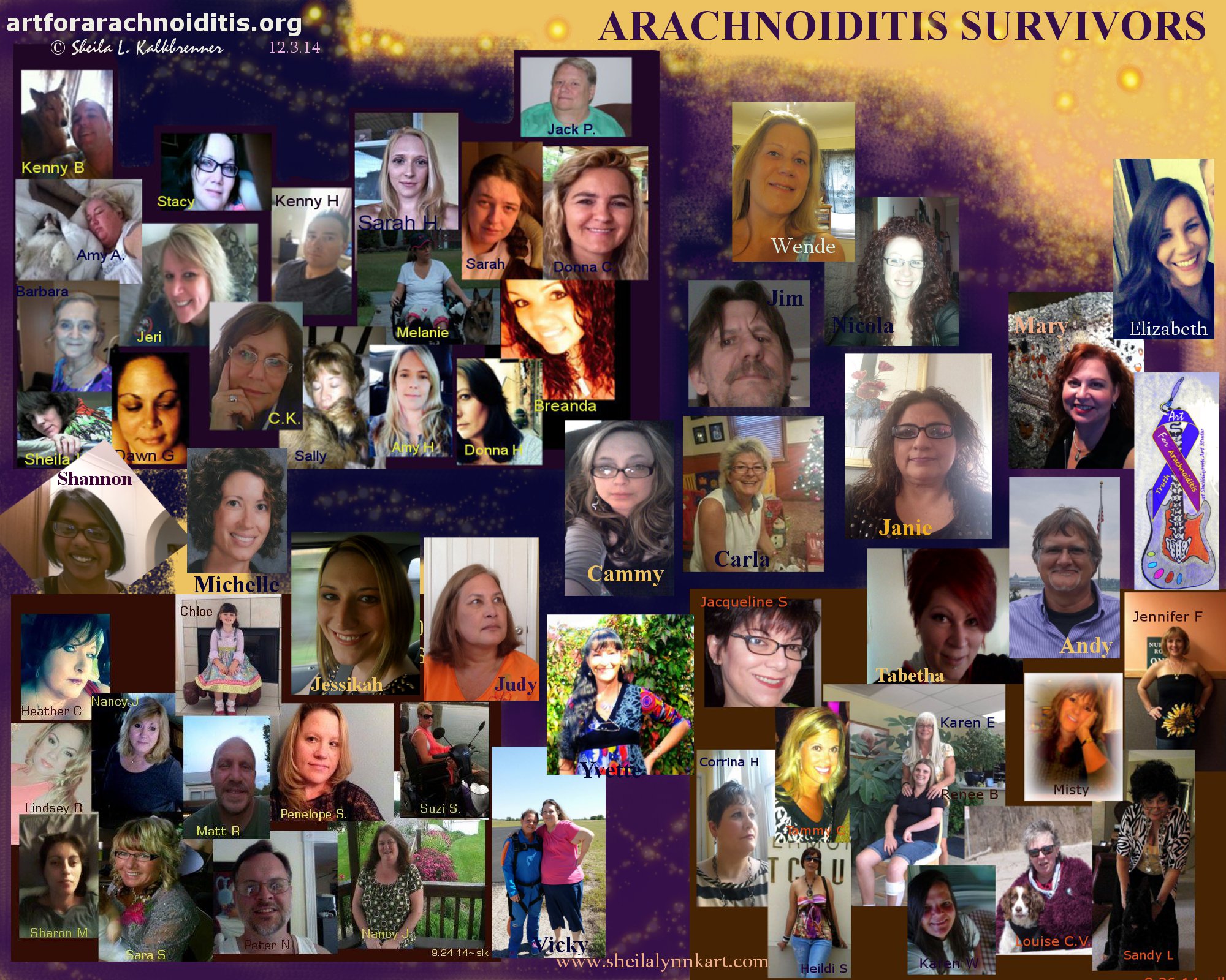 The Album of the Survivors Collage #5 December 4, 2014The Album of the Arachnoiditis Survivorssheilalynnkart The Album of the Survivors Anyone in the world surviving with an Arachnoiditis Diagnosis is welcome to submit a selfie to this album. Share this: Click to share on X (Opens in new window) X Click to share on Facebook (Opens in new window) Facebook Like Loading... Related