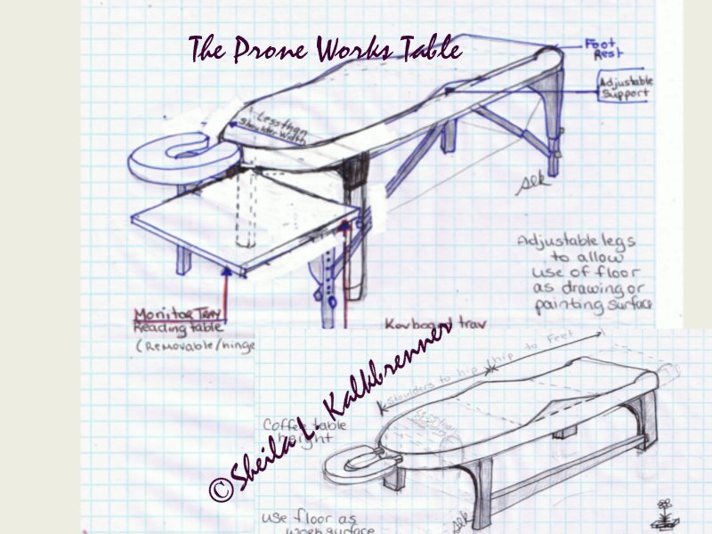 I hated being in bed looking at the ceiling..doing NOTHING. In the beginning there was so much pain that I didn’t really notice. But, gradually it became evident that horizontal time was controlling the pain. I had to figure out some way to be productive WHILE I was horizontal. I designed the ProneWorks table and consulted with occupational therapy to find out more about what my body would need to work this way. It became part of my studio business plan and I incorporated the design into my small business grant application. It was going to cost $1800 to make the first prototype.